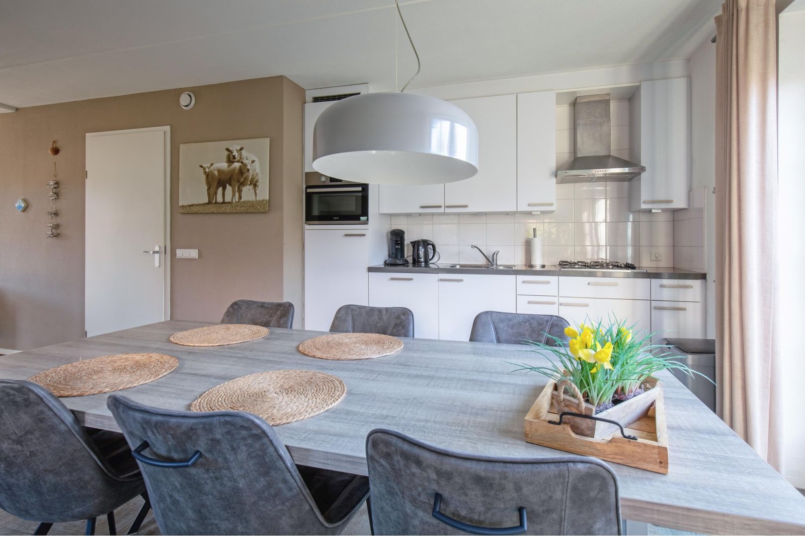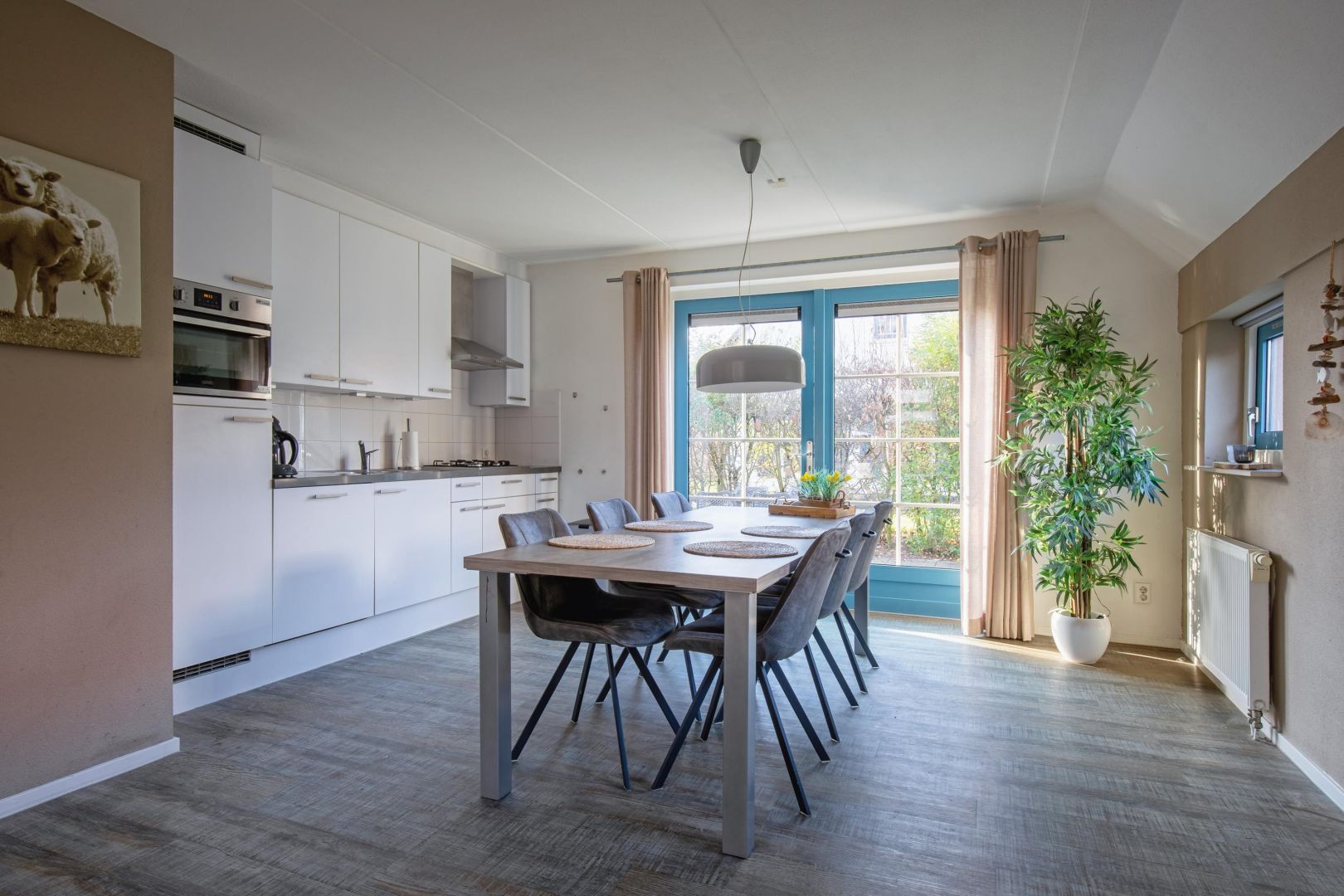 De keuken is compleet uitgevoerd en voorzien van onder andere een 4-pits gaskookplaat, afzuigkap, dubbele spoelbak, koelkast, magnetron en vaatwasser (2024). Via de openslaande deuren bereikt u het terras, wat zorgt voor een prettige verbinding tussen binnen en buiten.