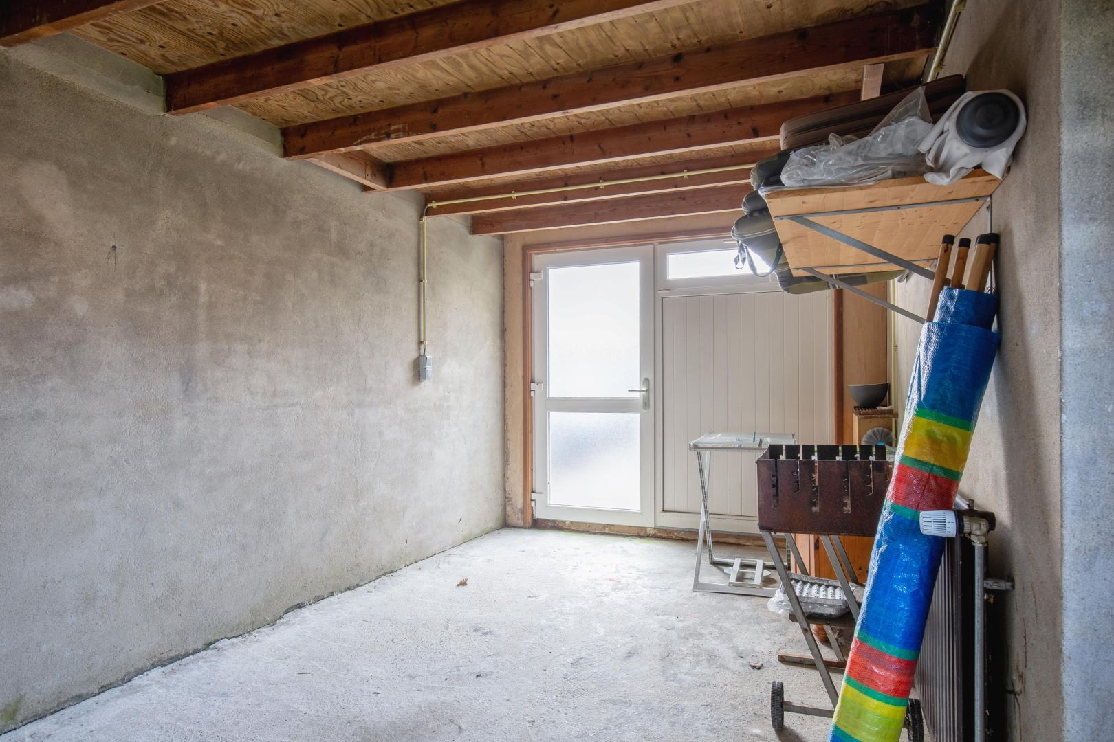Naast de woning is een garage (buitenom bereikbaar). Hier zijn aansluitingen voor een wasmachine en hier is ook de opstelling van de cv-ketel.
