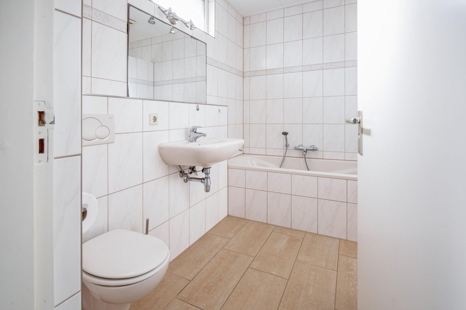 De badkamer is voorzien van een ligbad, douche, wastafel en vrijdragend toilet. Daarnaast is er ook een separate toiletruimte met een vrijdragend toilet en fonteintje.