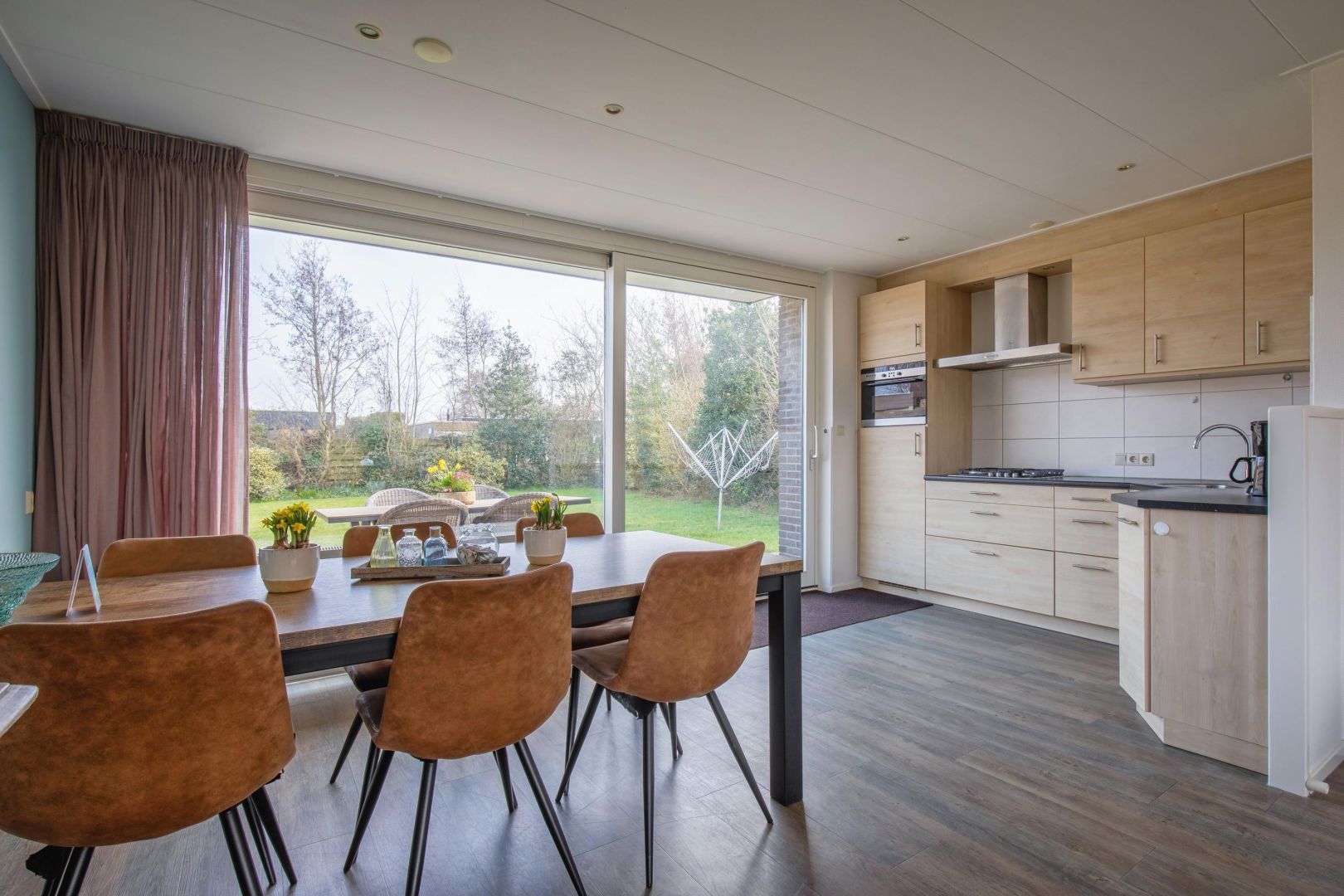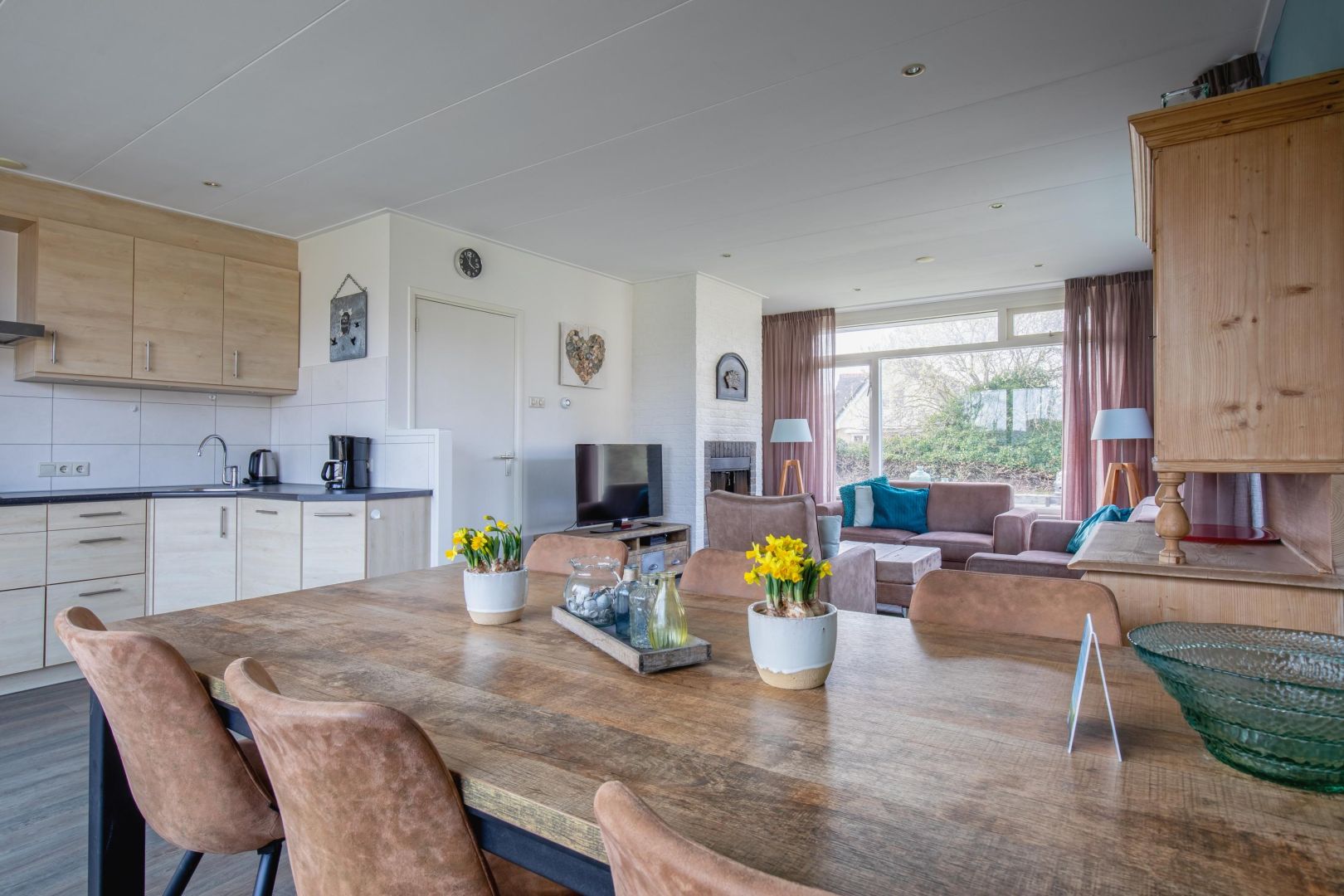 De straatgerichte woonkamer is gezellig ingericht met een haard en naast de woonkamer is de eethoek met een schuifpui naar de tuin.