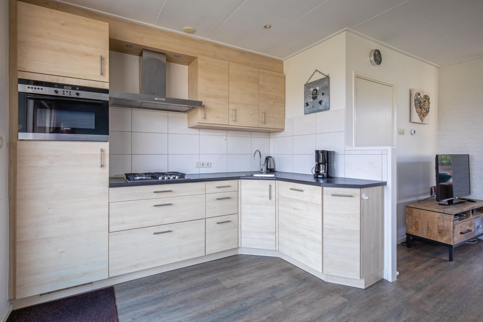 De keuken heeft een hoekopstelling en beschikt over een spoelbak, 4-pits gaskookplaat, afzuigkap, magnetron, koelkast en vaatwasser.
