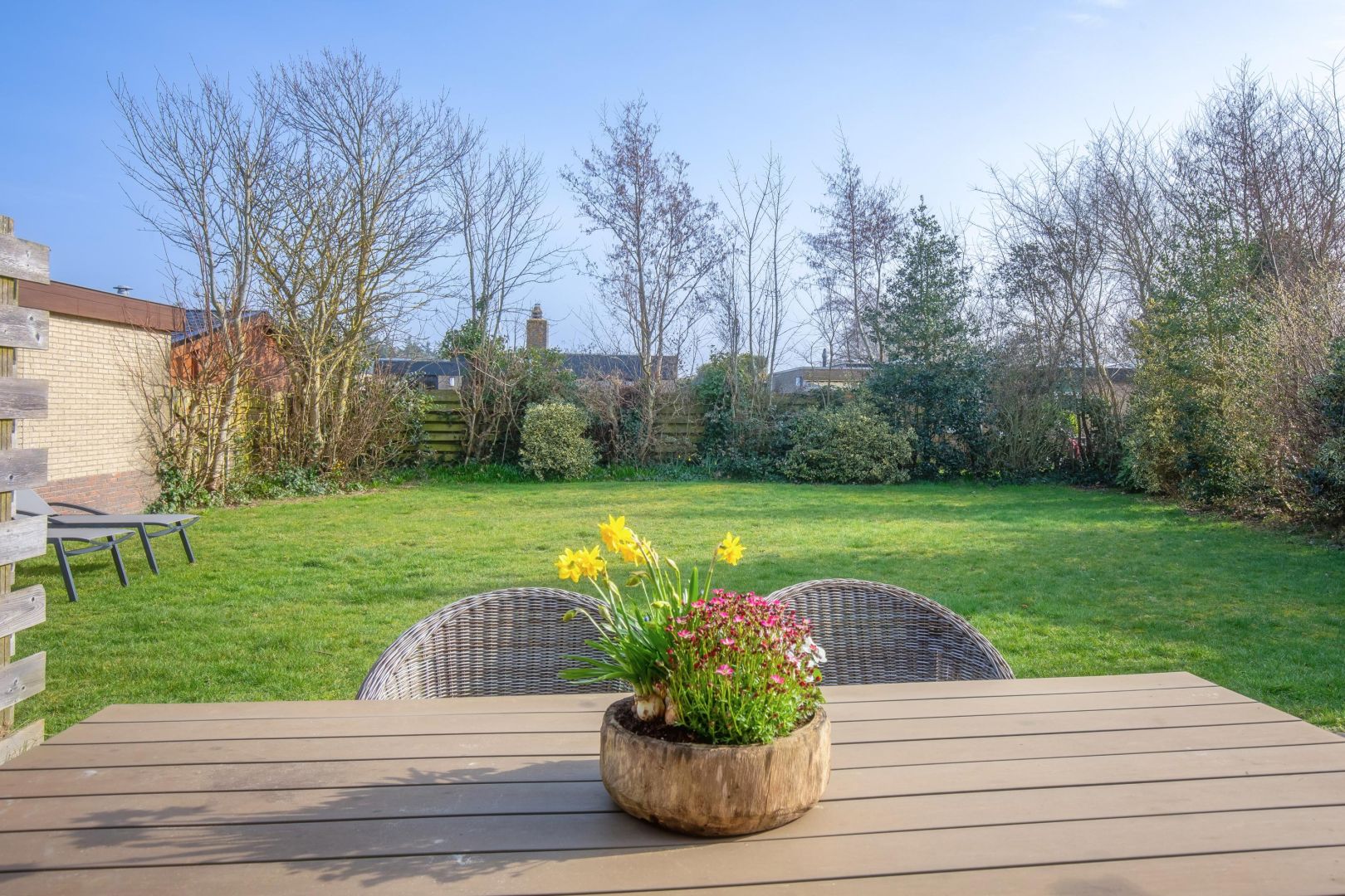 De tuin heeft een gunstige zonligging en er is een ruim grasveld en een terras. De royale tuin biedt volop plek om te ontspannen, te luisteren naar vogels of gewoon te genieten van de zon en de rust. Een perfecte plek om de hectiek van alledag achter u te laten. Aan de voorzijde is parkeergelegenheid voor meerdere voertuigen.