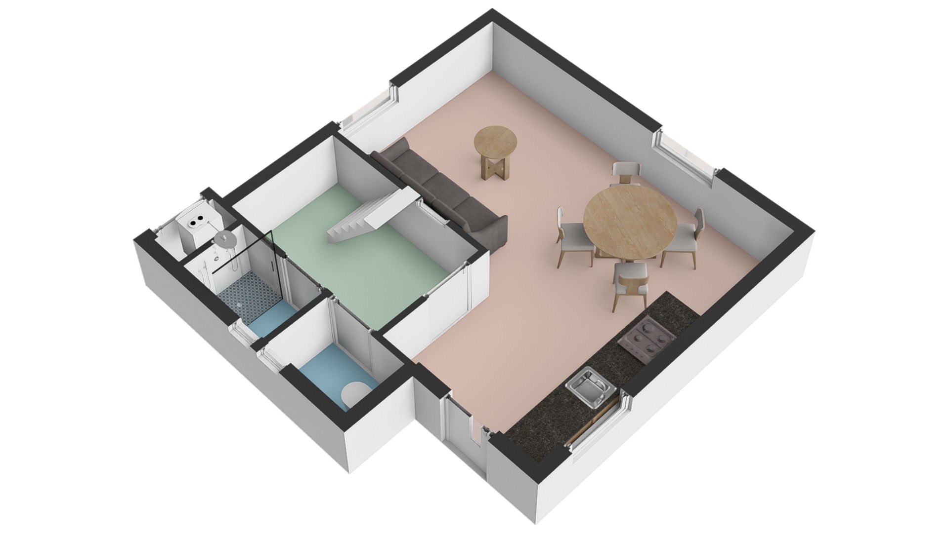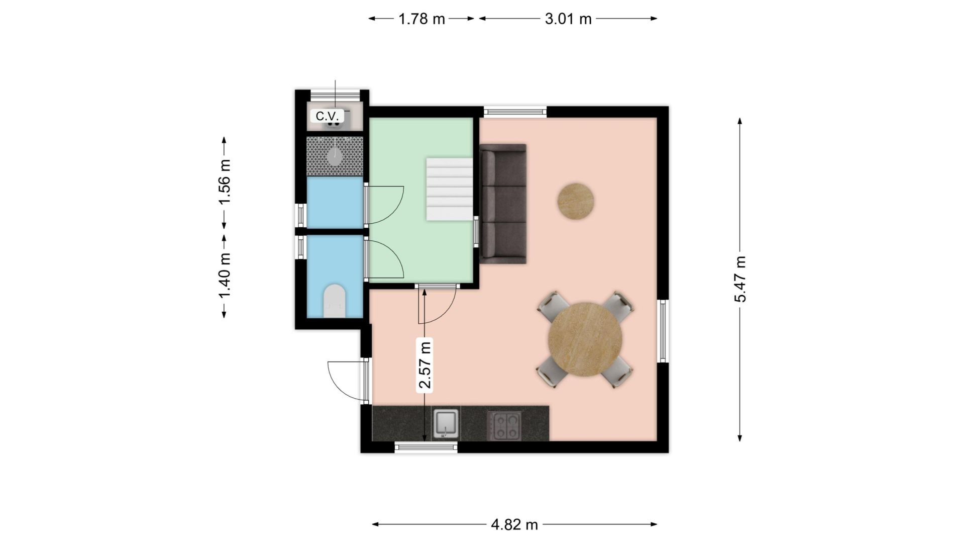Indeling: entree in hal met toegang tot de woonkamer, keuken, toiletruimte (met vrijdragend toilet en fonteintje), kelder (ca. 5 m2) en trap naar de bovenverdieping.