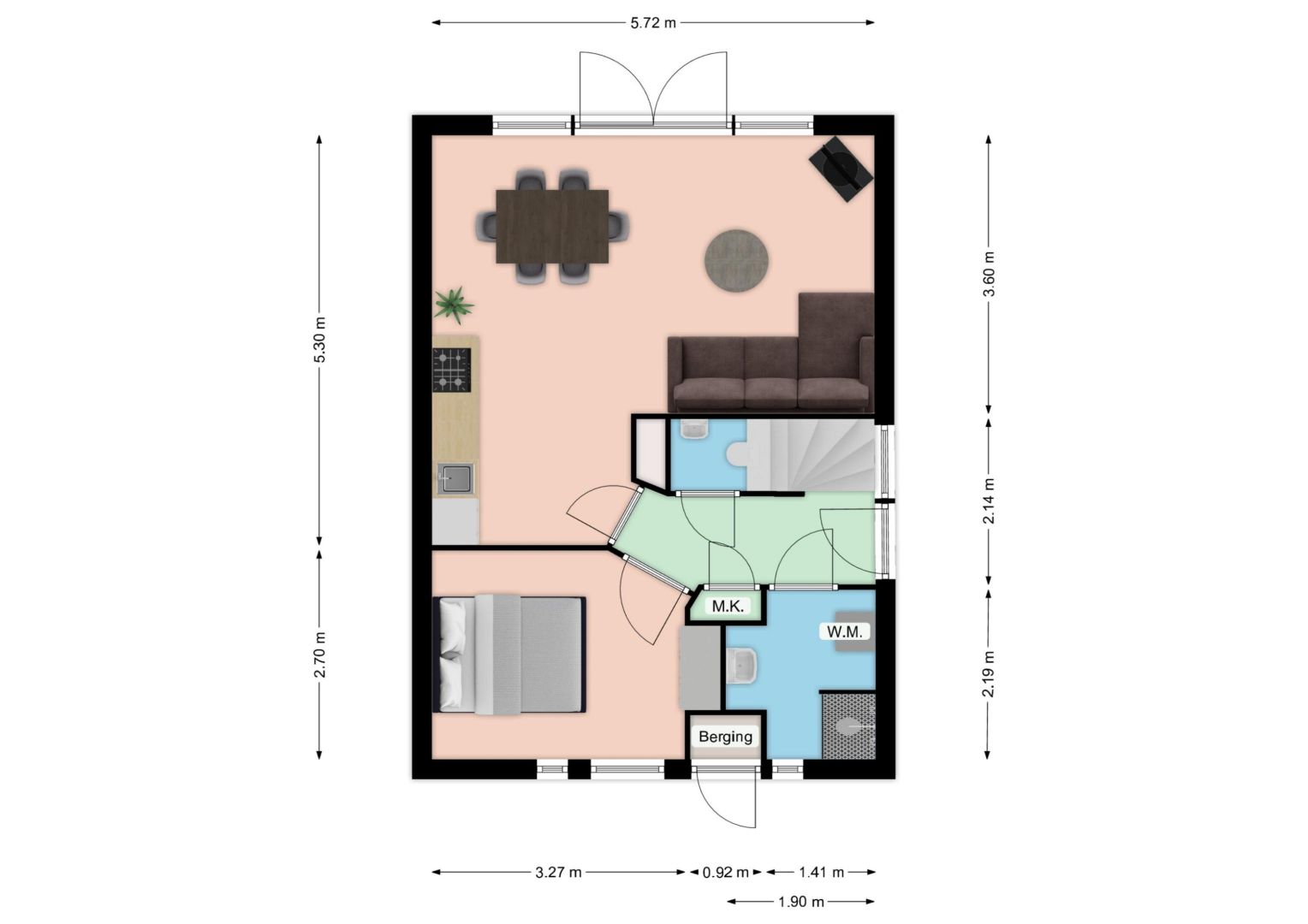 Indeling: entree in hal met toegang tot woonkamer, badkamer, toiletruimte, slaapkamer en trap naar de bovenverdieping. De woonkamer is voorzien van een pvc-vloer en er zijn openslaande deuren naar het terras.