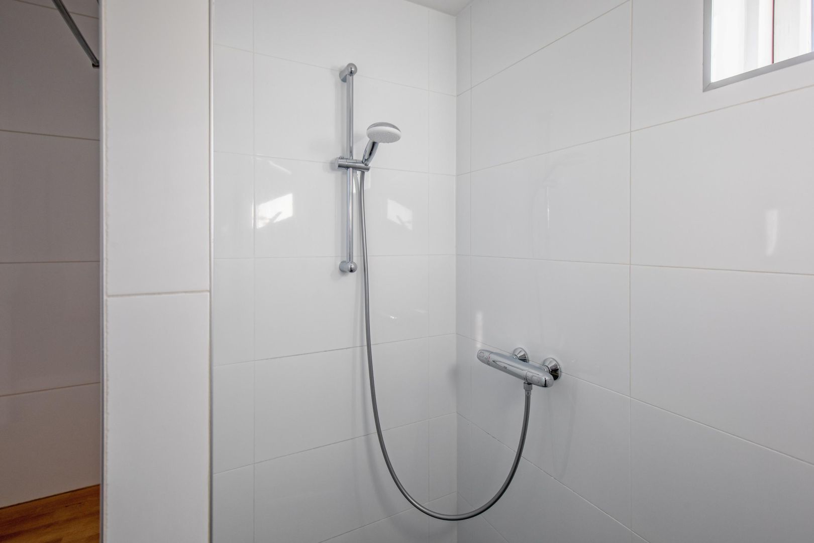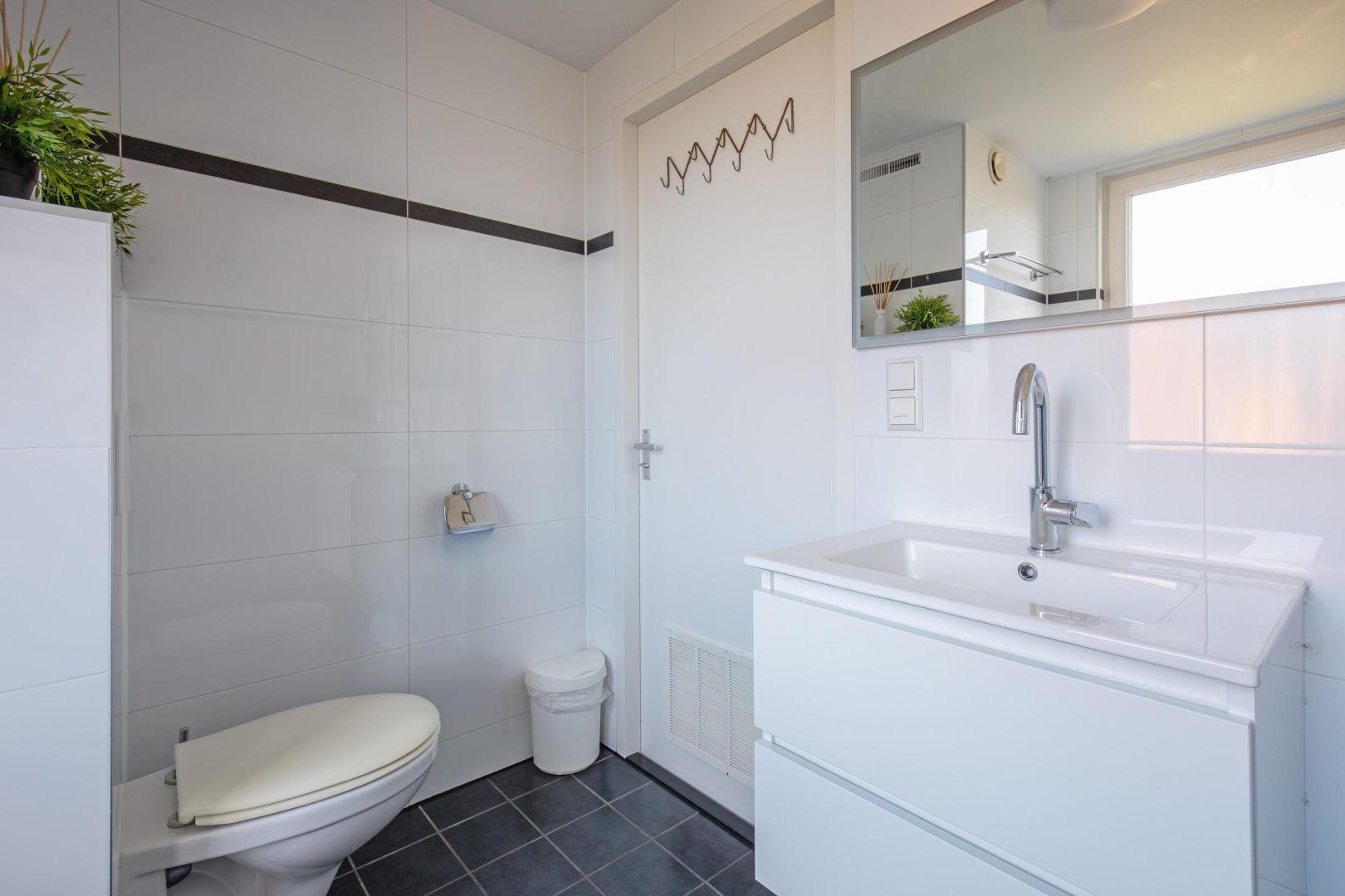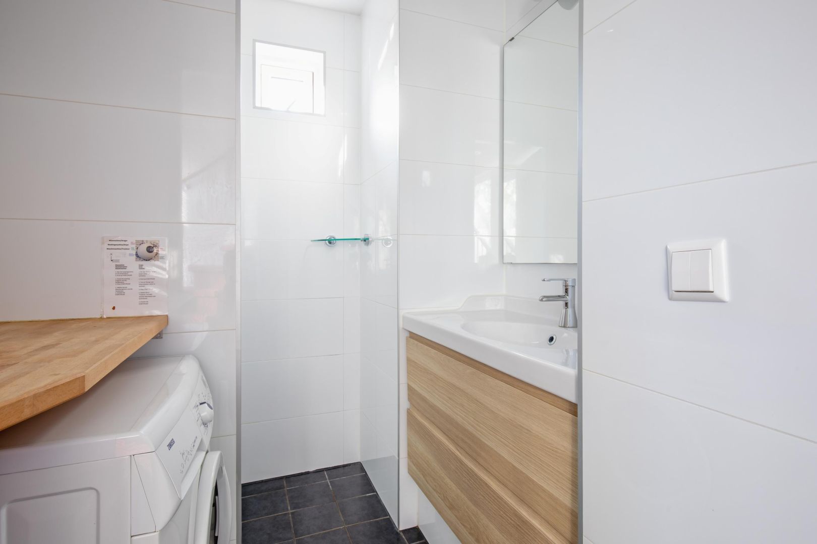De badkamer (b.g.) is uitgevoerd met inloopdouche, wastafelmeubel en aansluitingen voor de wasmachine. De toiletruimte is separaat met vrijdragend toilet en een fonteintje.