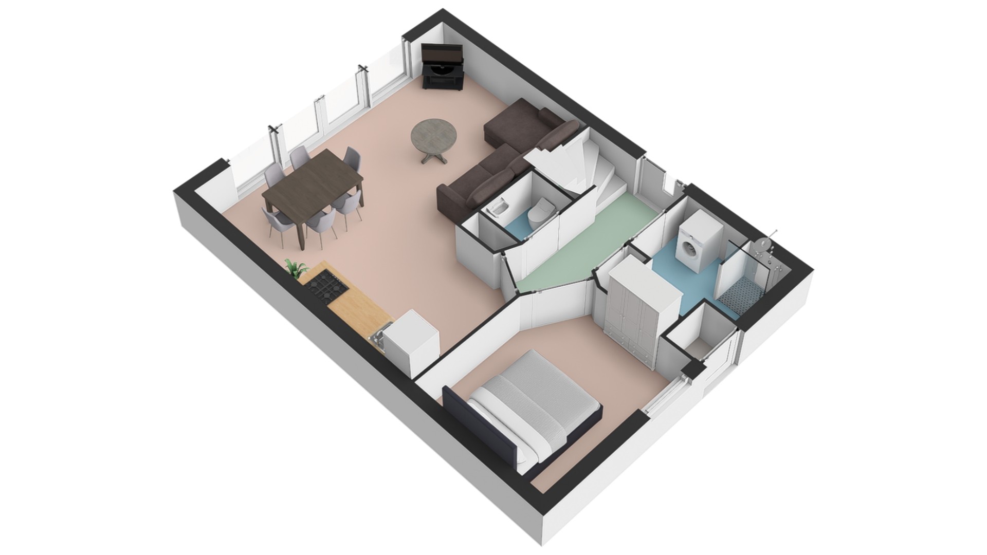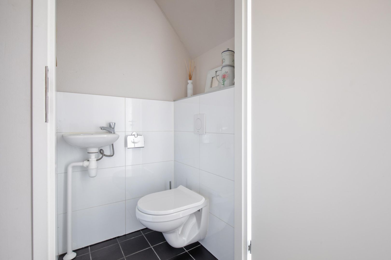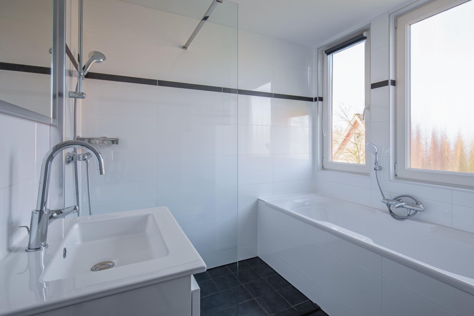 De badkamer (b.g.) is uitgevoerd met inloopdouche, wastafelmeubel en aansluitingen voor de wasmachine. De toiletruimte is separaat met vrijdragend toilet en een fonteintje.