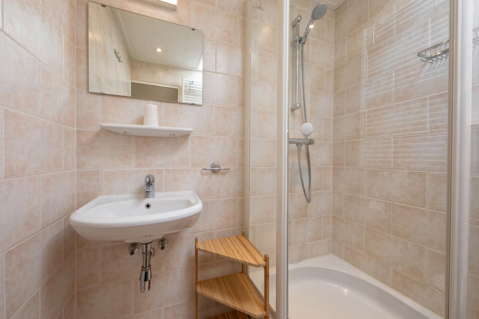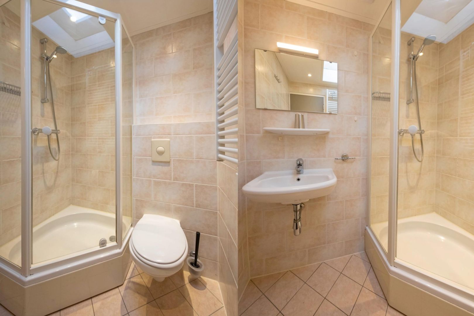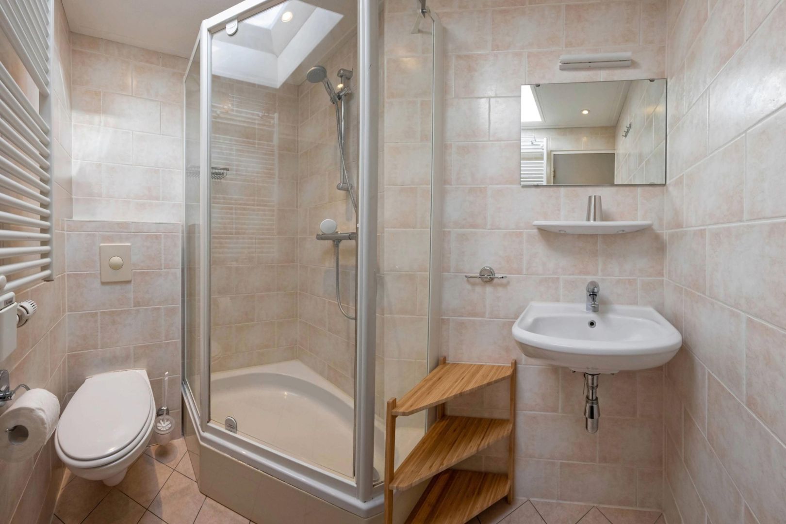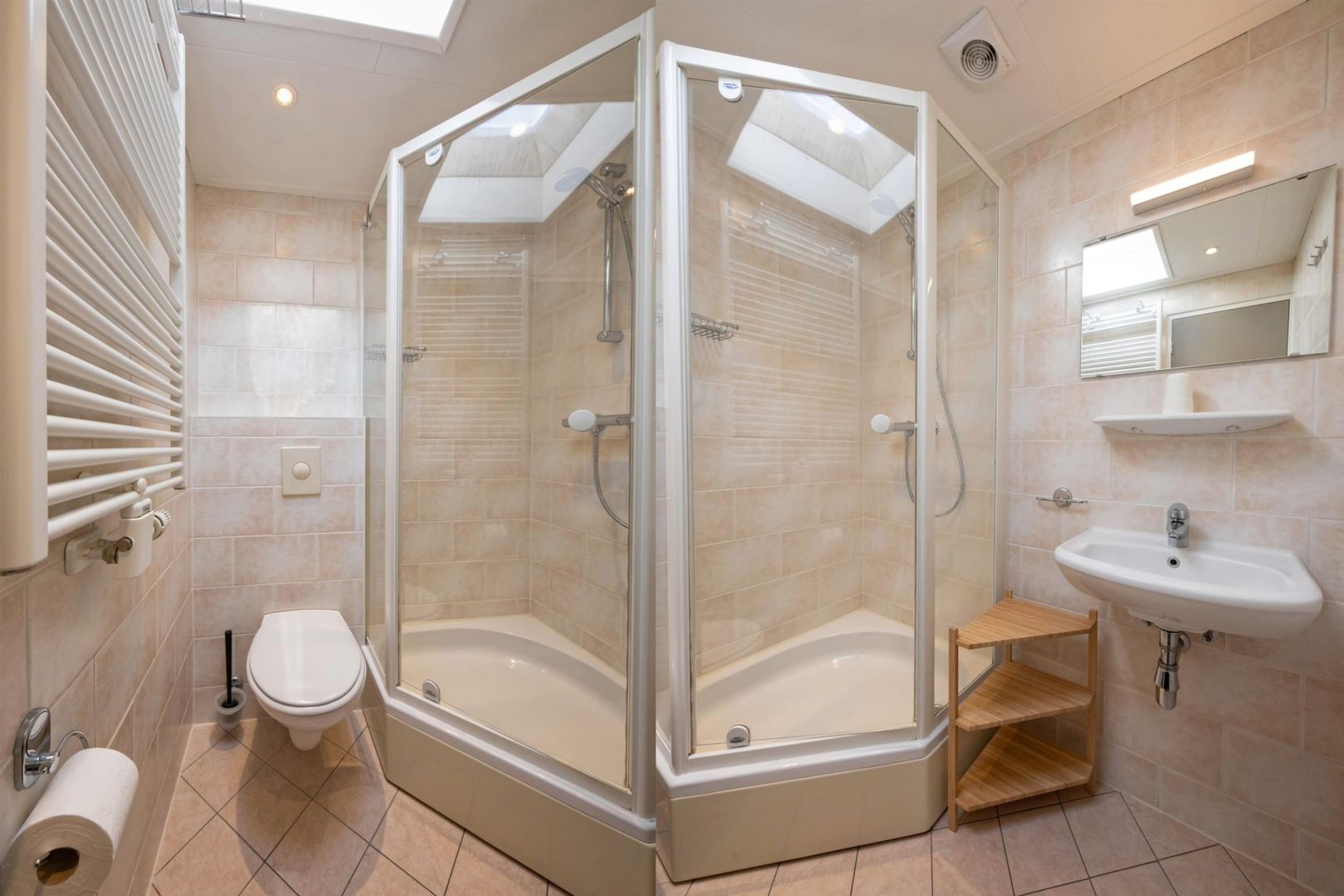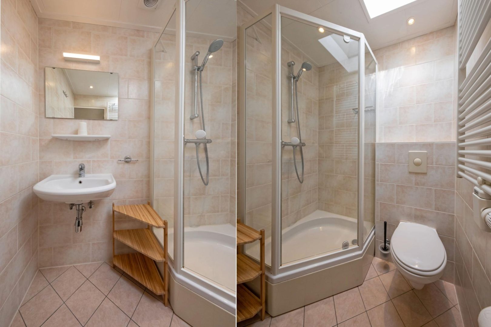 De badkamers zijn uitgevoerd met douche, wastafel en vrijdragend toilet.