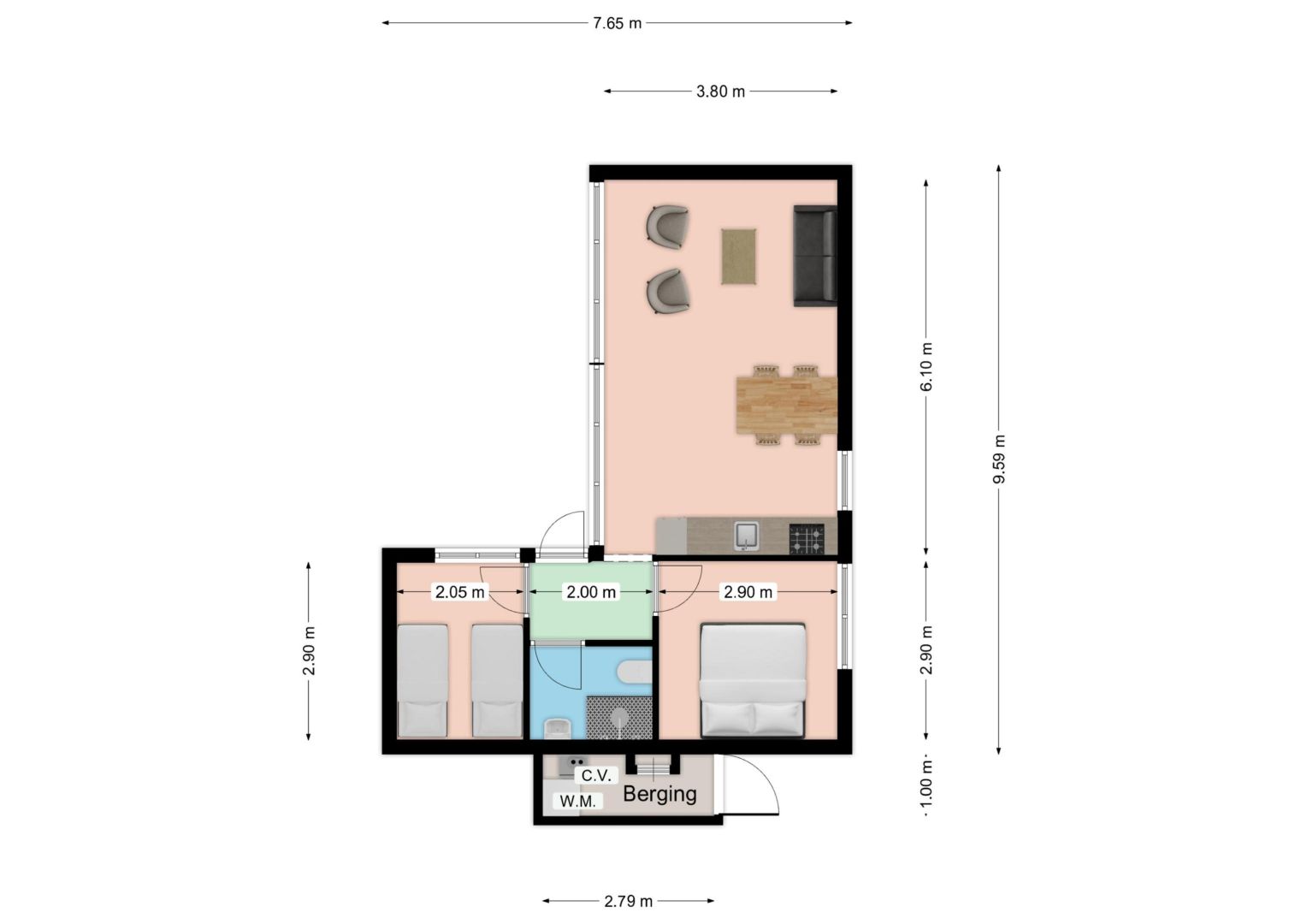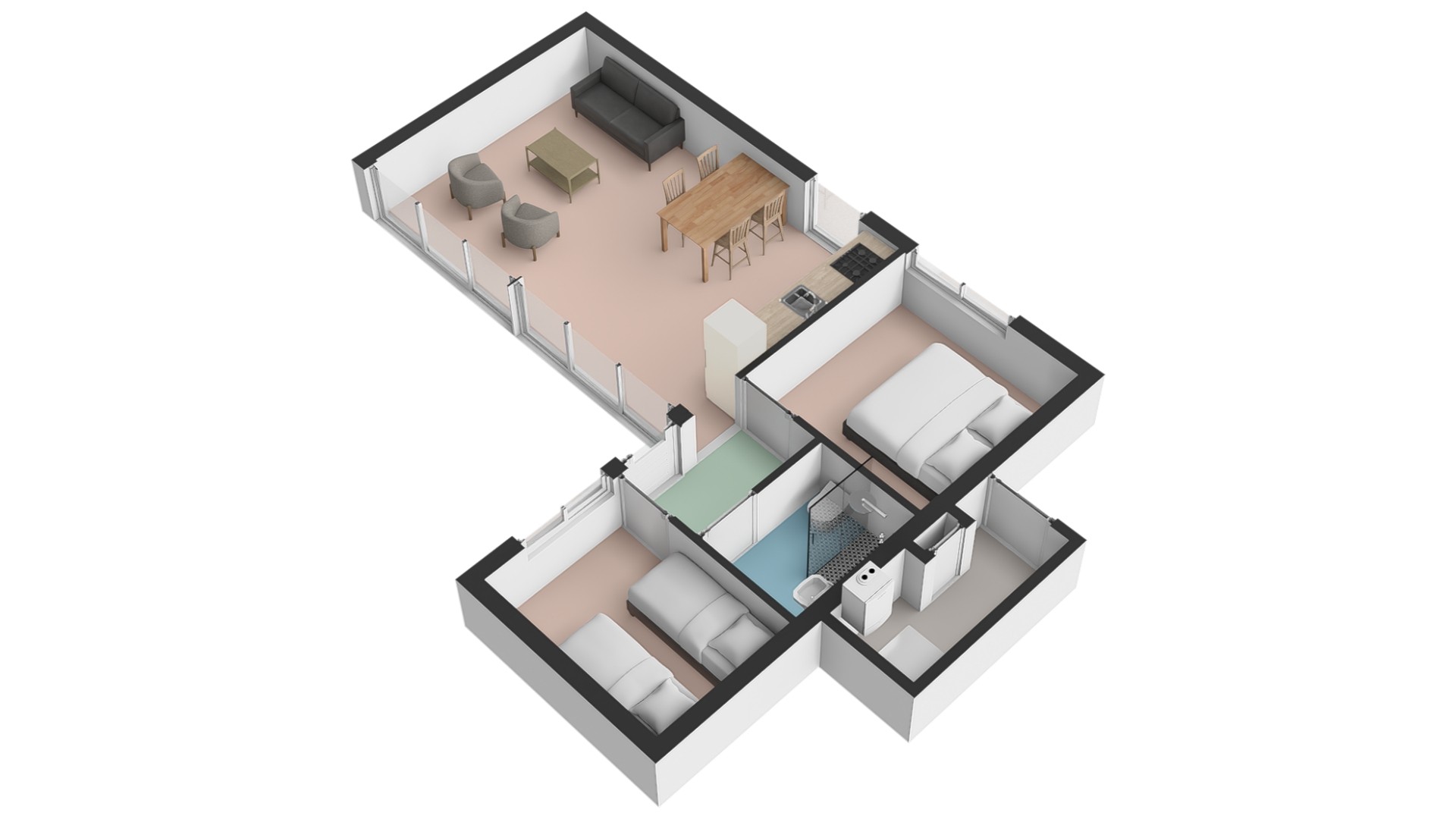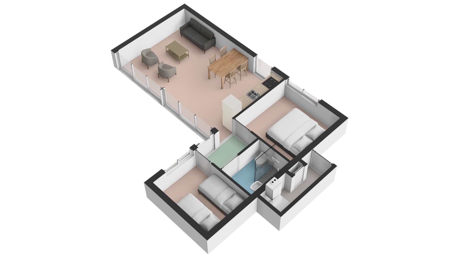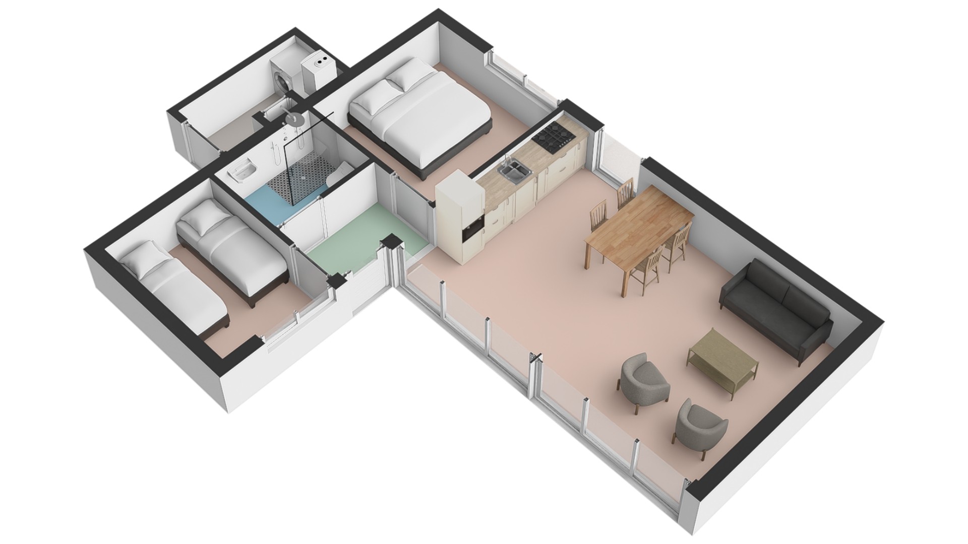 Elke woning telt twee slaapkamers, waarvan er één beschikt over een 2-persoonsbed en in de andere slaapkamer zijn twee éénpersoonsbedden.