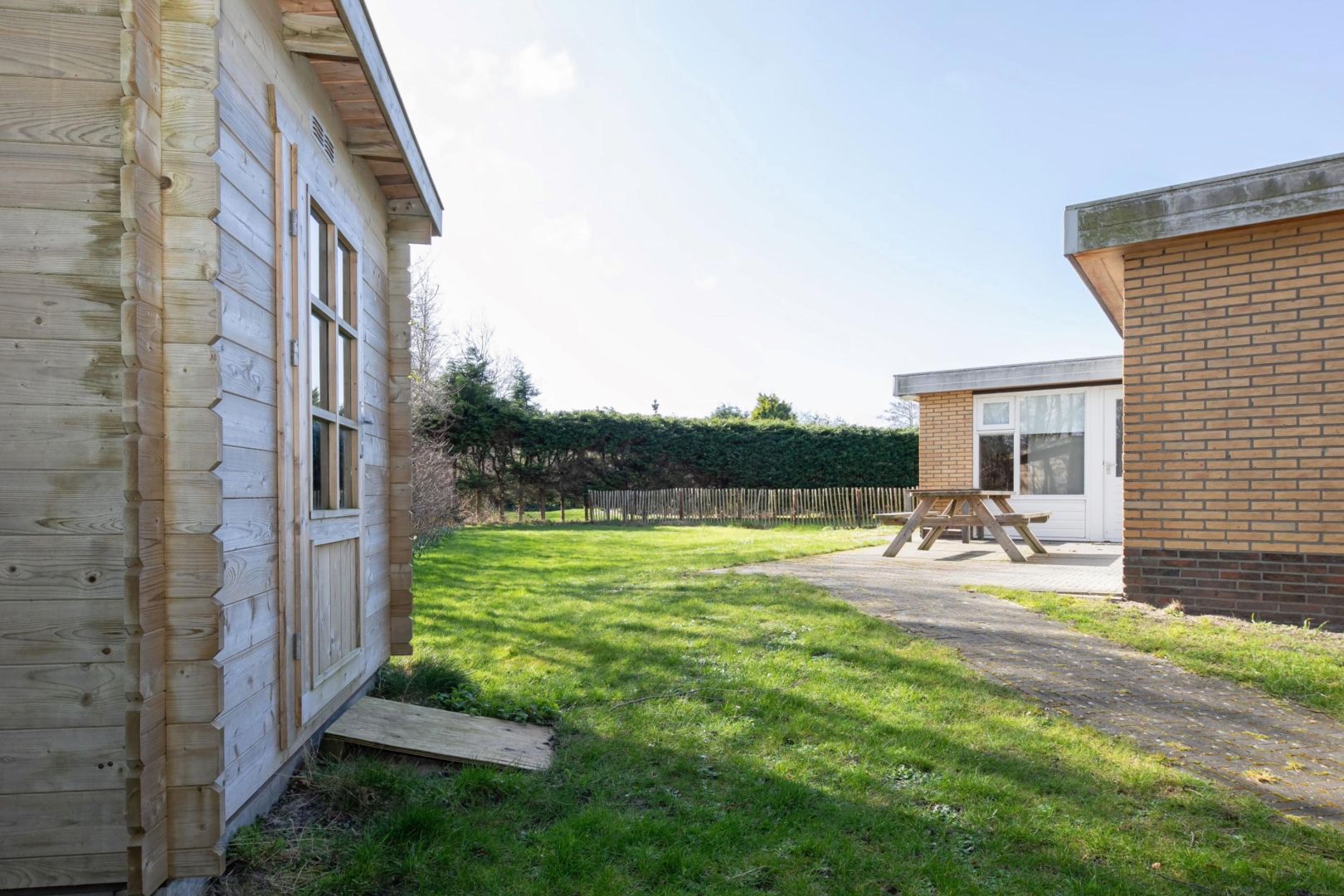 In de tuin treft u bij elke woning een grasveld en een terras, evenals een tuinhuis van circa 5 m². Er is parkeergelegenheid op eigen terrein.